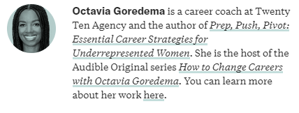 Octavia Goredema is a career coach at Twenty Ten Agency and the author of Prep, Push, Pivot: Essential Career Strategies for Underrepresented Women. She is the host of the Audible Original series How to Change Careers with Octavia Goredema.
