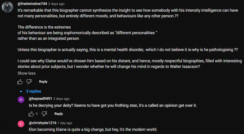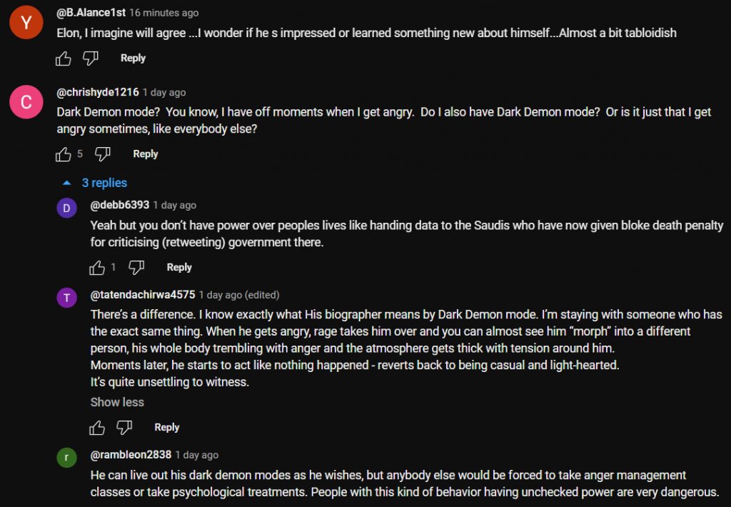 One thought on “Elon Musk Biographer says Billionaire has ‘Dark Demon Mode’ ๐Ÿ‘จโ€๐Ÿš€๐Ÿš€